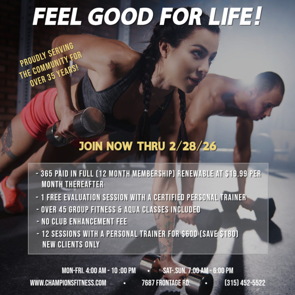 Champions Fitness Center has been proudly serving the community for over 35 years, and we’re excited to announce our limited-time membership offers!